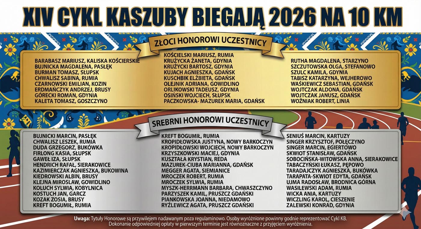 ✔ Dystans 10 km – dla każdego Dystans, który daje satysfakcję początkującym i pozwala ambitnie rywalizować doświadczonym biegaczom. ✔ Pamiątkowy medal Każdy uczestnik, który ukończy bieg, otrzymuje pamiątkowy medal – symbol udziału w wyjątkowym wydarzeniu i kolejnego sportowego celu zrealizowanego na Kaszubach. ✔ Losowanie nagród na każdym biegu Na każdym biegu odbywa się losowanie nagród wśród wszystkich uczestników, niezależnie od osiągniętego czasu. ✔ Duża liczba klasyfikacji – realne szanse na nagrody Cykl oferuje wiele klasyfikacji, dzięki czemu niemal każdy uczestnik może znaleźć swoją sportową rywalizację:- klasyfikacja Open Kobiet i Mężczyzn,
