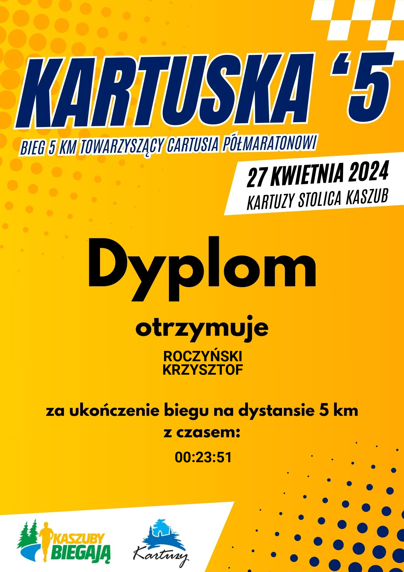 | 63 | ROCZYŃSKI | KRZYSZTOF | 114 | M | 49 | GDAŃSK | ROCZYŃSKI TEAM | M50-59 | 12 | 00:23:51 | 00:23:40 | Pobierz |