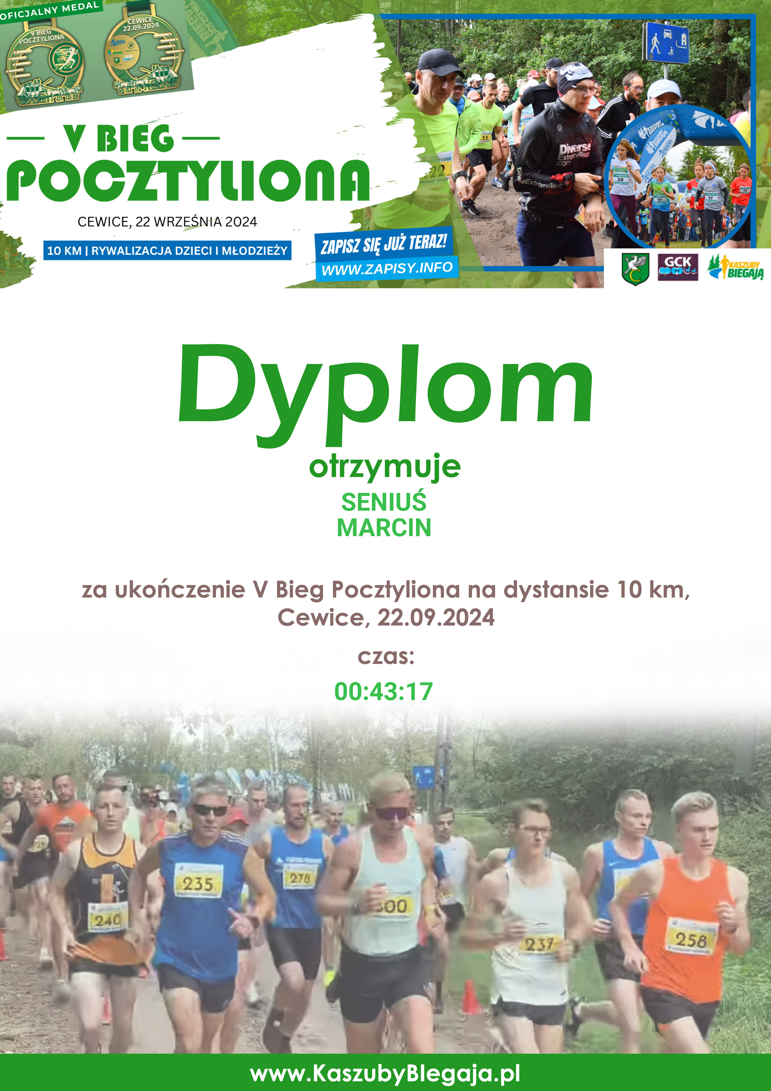 | 14 | SENIUŚ | MARCIN | 278 | M | 13 | KARTUZY | KARTUSKI TEAM | M40-49 | 1 | 00:43:17 | 00:43:17 | Pobierz |