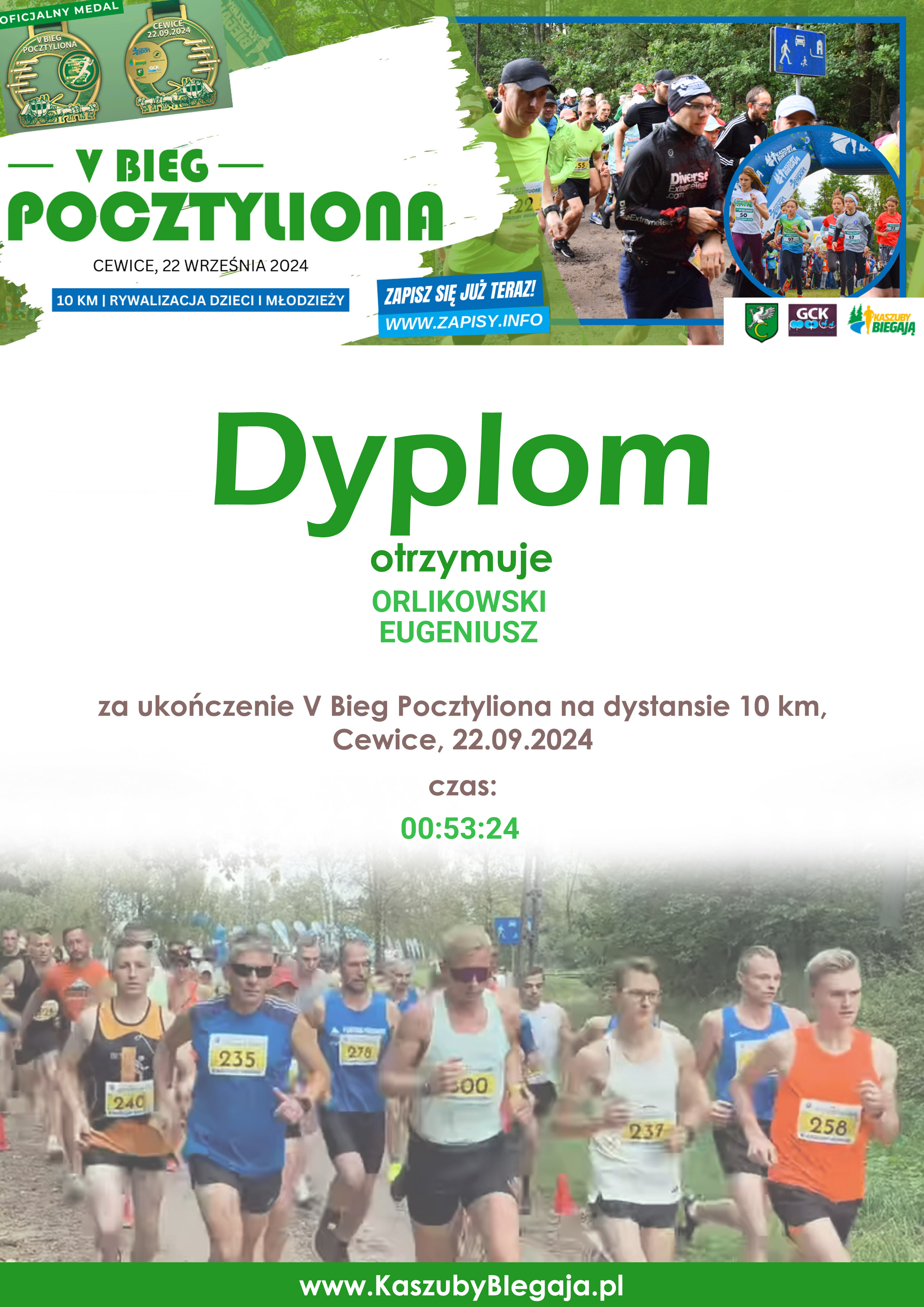 | 42 | ORLIKOWSKI | EUGENIUSZ | 264 | M | 37 | GDYNIA | BIEGAJĄCA GDYNIA | M70+ | 1 | 00:53:24 | 00:53:24 | Pobierz |