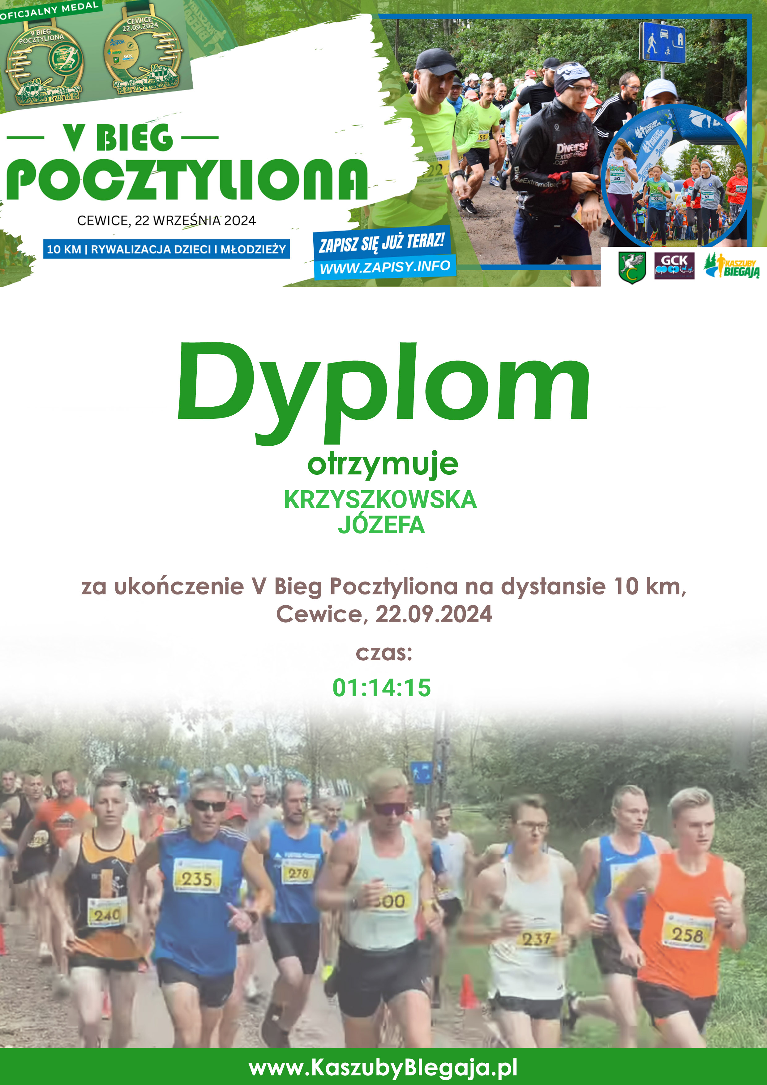 | 89 | KRZYSZKOWSKA | JÓZEFA | 243 | K | 26 | GDYNIA | K50-59 | 4 | 01:14:15 | 01:14:15 | Pobierz | |