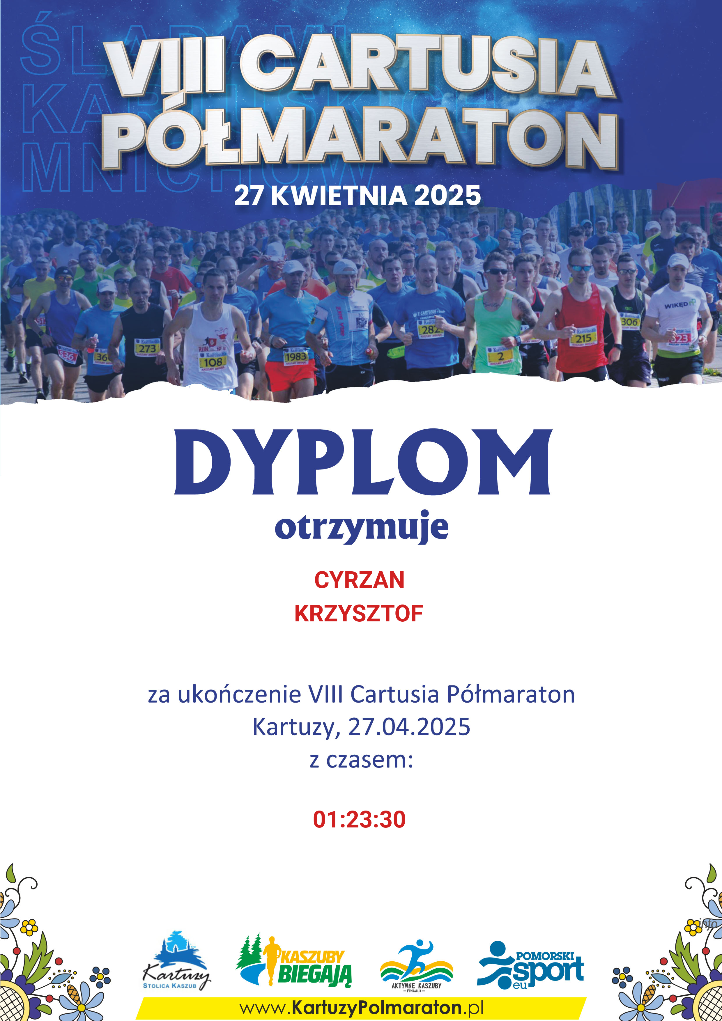 | 6 | CYRZAN | KRZYSZTOF | 415 | M | 6 | KARTUZY | ROWEROWCE | M30-39 | 01:23:30 | 01:23:30 | Pobierz | |