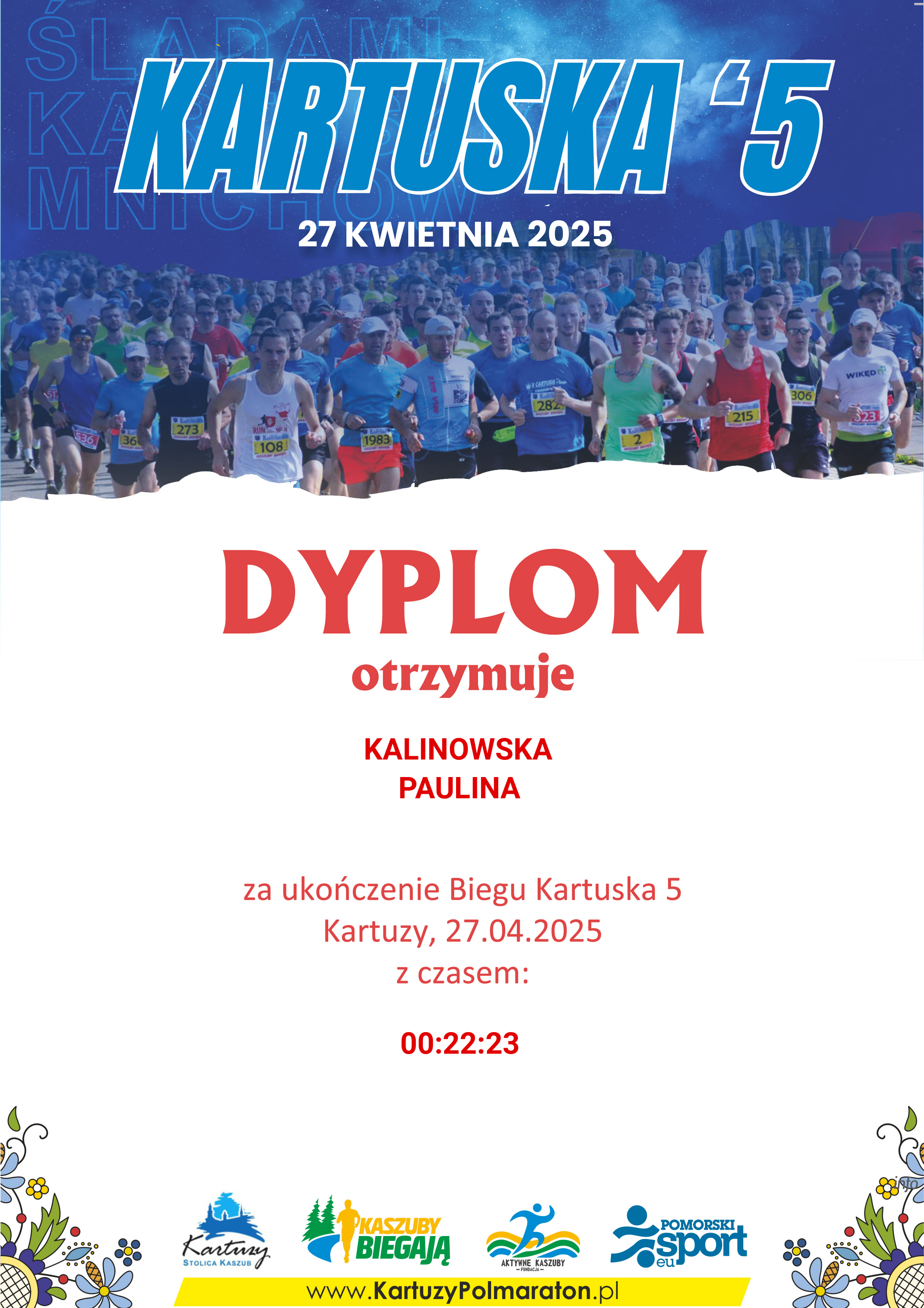 | 30 | KALINOWSKA | PAULINA | 165 | K | 5 | KIEŁPINO | PROJEKT 1000 UP | K30-39 | 00:22:23 | 00:22:23 | Pobierz | |