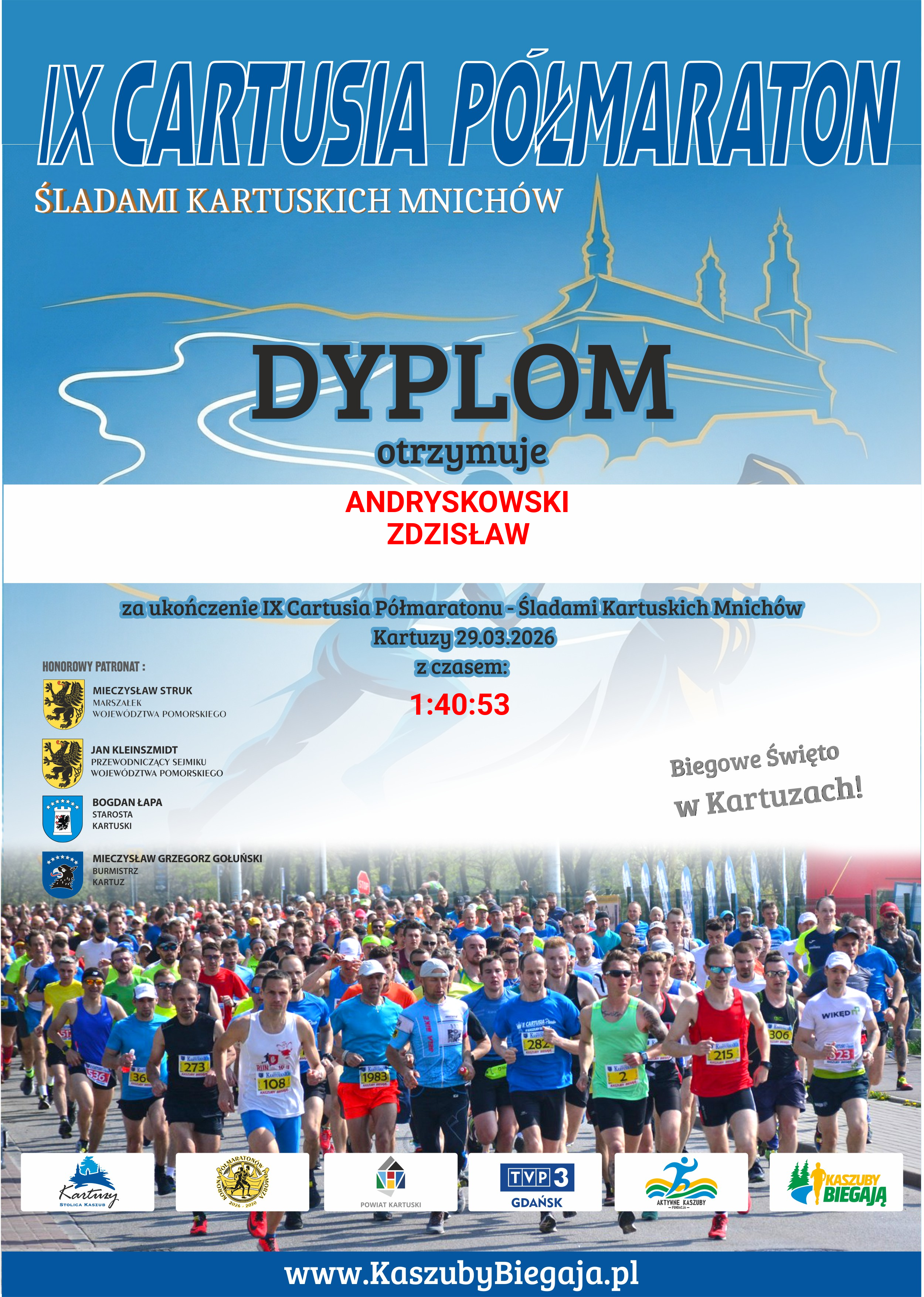 | 33. | TRZASKA | PRZEMYSŁAW | 501 | M | 32. | M40-49 | 9 | BĄKOWO | KS MASTERS KOLBUDY | 1:26:25 | Pobierz |
