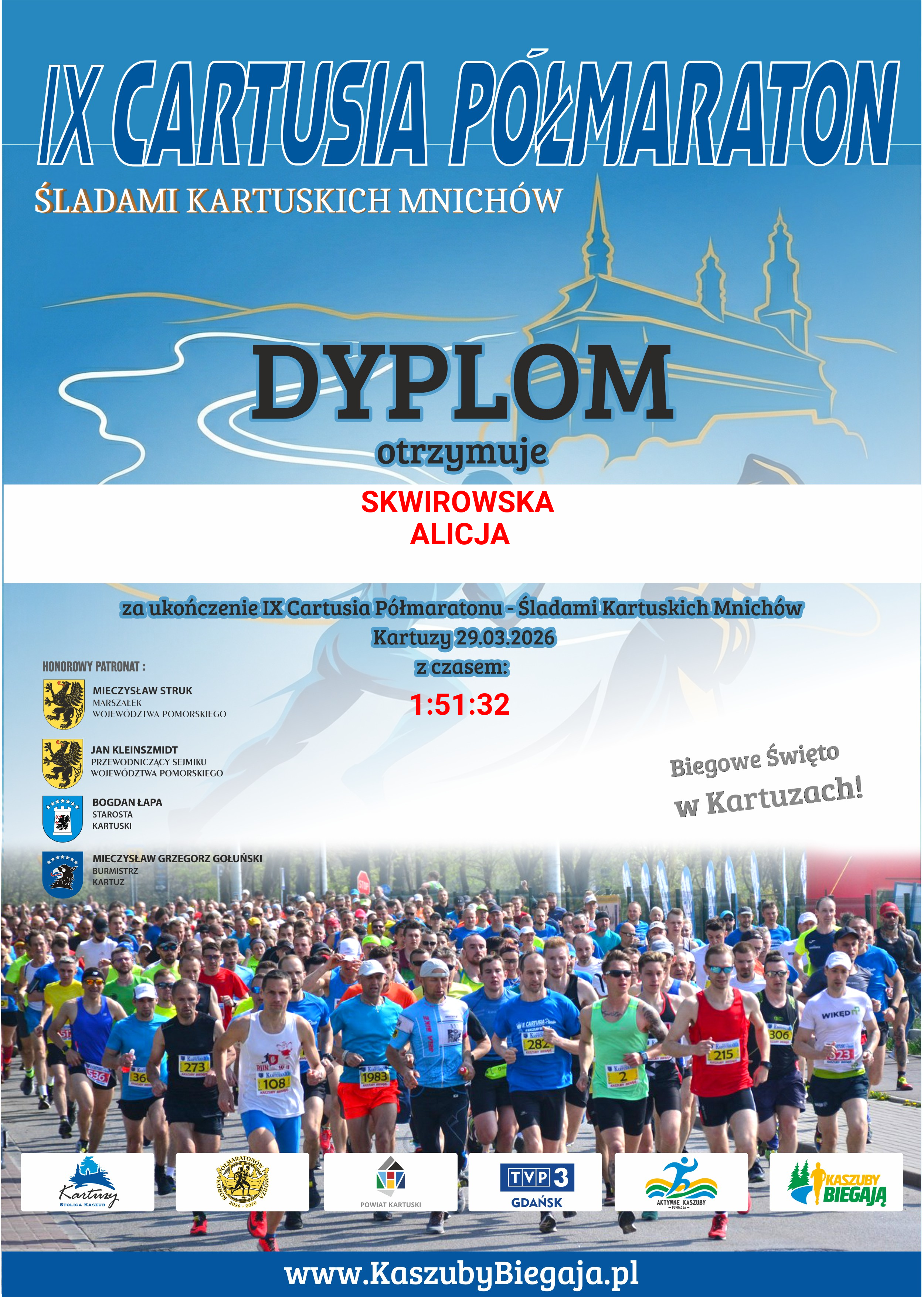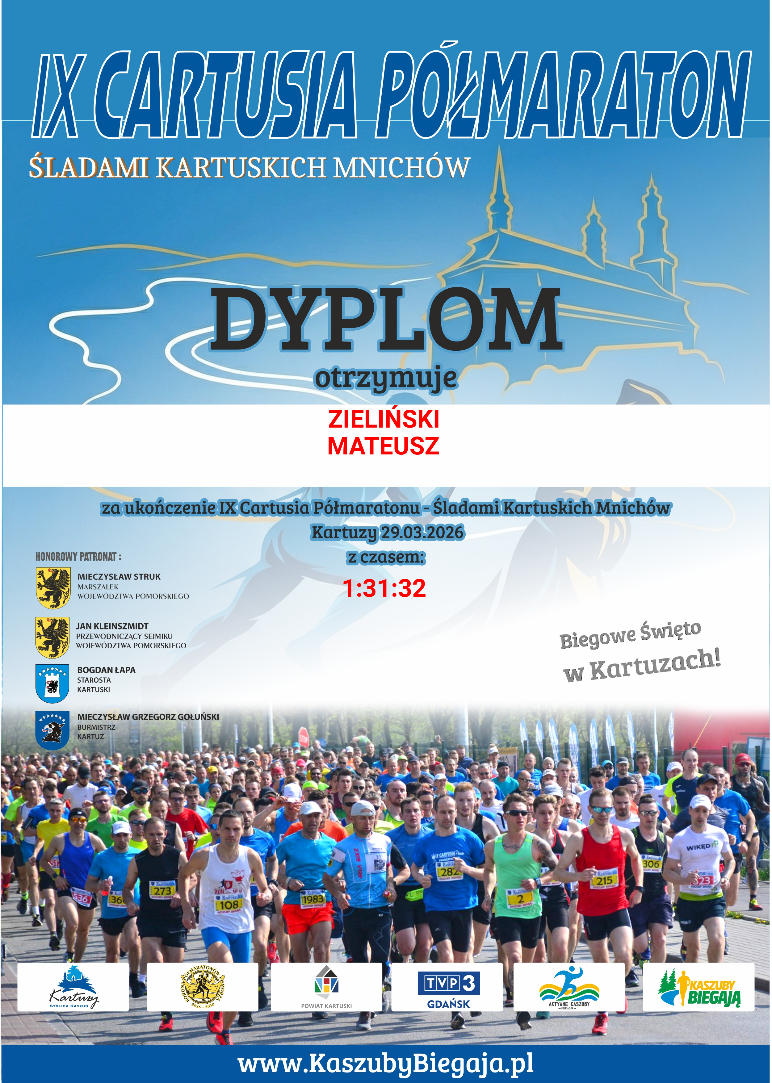 | 32. | GNIOT | TOMASZ | 131 | M | 31. | M30-39 | 11 | ZAKRZEWO | ZALEWSKIPERFORMANCEACADEMY | 1:26:22 | Pobierz |