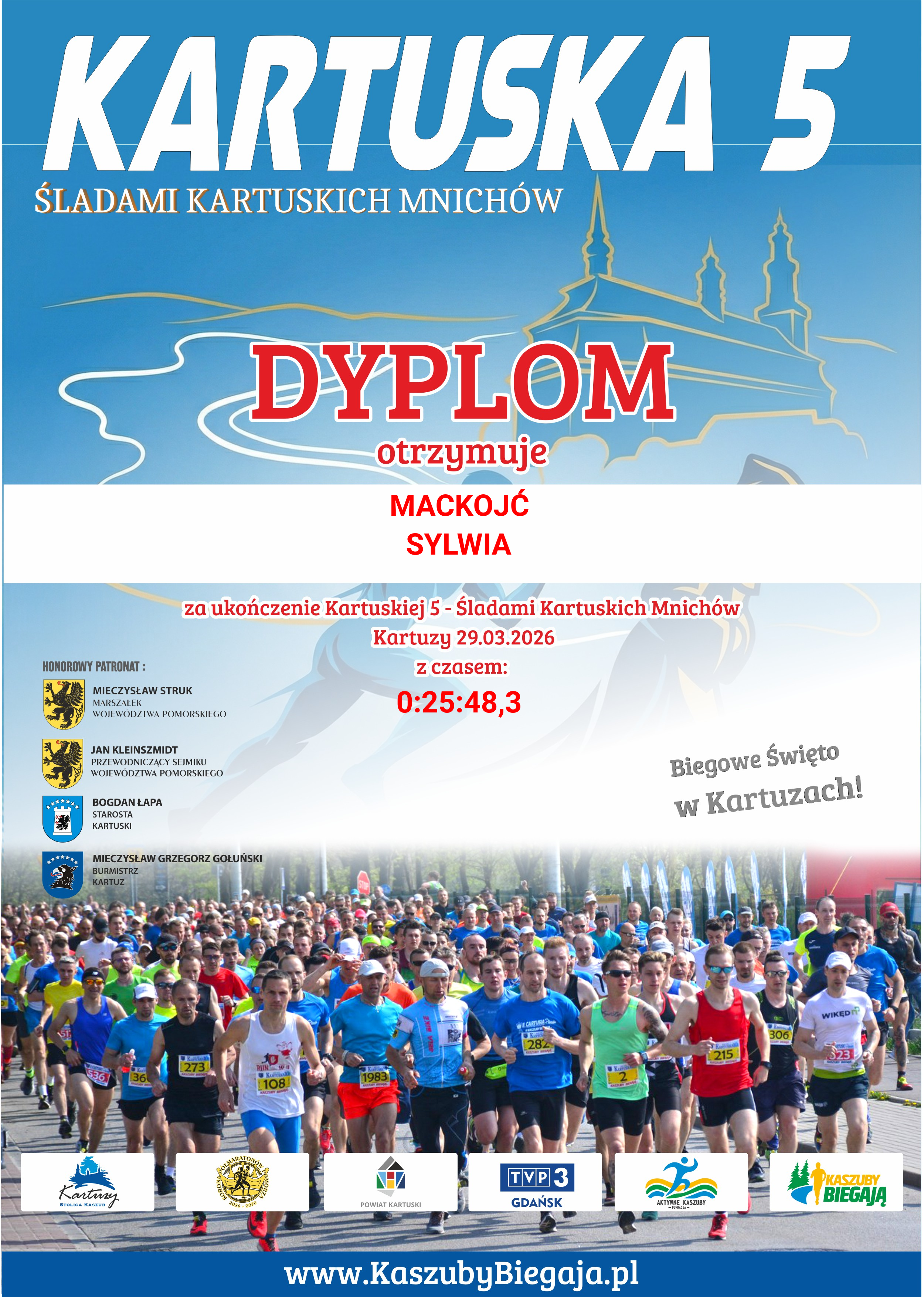 | 48. | MACKOJĆ | SYLWIA | 733 | K | 11. | K12-29 | 1 | KARTUZY | FORMA FITNESS KLUB KARTUSKI | 0:25:48,3 | Pobierz |